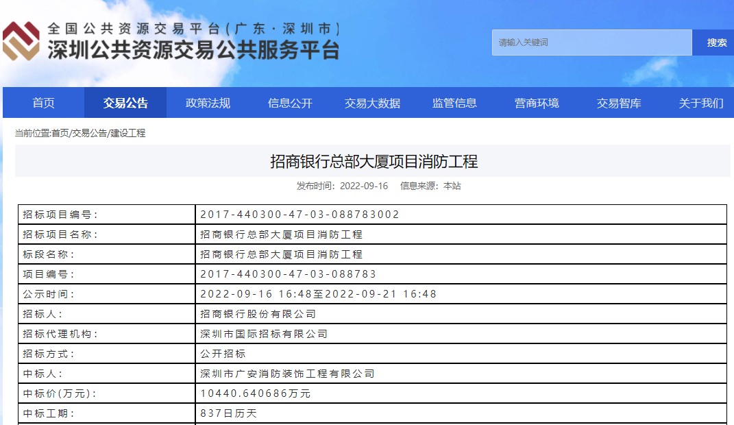 該項(xiàng)目的消防專業(yè)分包工程采取公開招投標(biāo)的方式進(jìn)行,2022年9月21日,深圳市公共資源交易公共服務(wù)平臺(tái)通過公示流程,正式確立深圳市廣安消防裝飾工程有限公司中標(biāo)該項(xiàng)目消防工程!