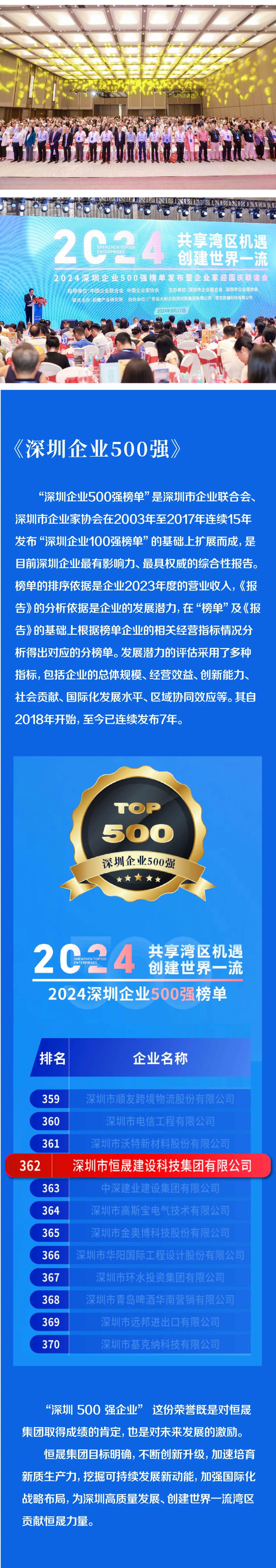 恒晟集團榮登“2024深圳企業500強榜單”