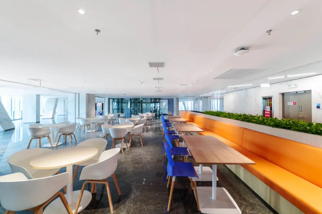 走進(jìn)A棟6層中庭連廊,首先步入眼簾的是高達(dá)12米的中庭連廊,頂部采用防曬膜,地面采用不同顏色人造石進(jìn)行鋪裝,光亮大氣油然而生;墻面再搭配白色和木紋轉(zhuǎn)印鋁板的裝飾,整體風(fēng)格簡約大氣。