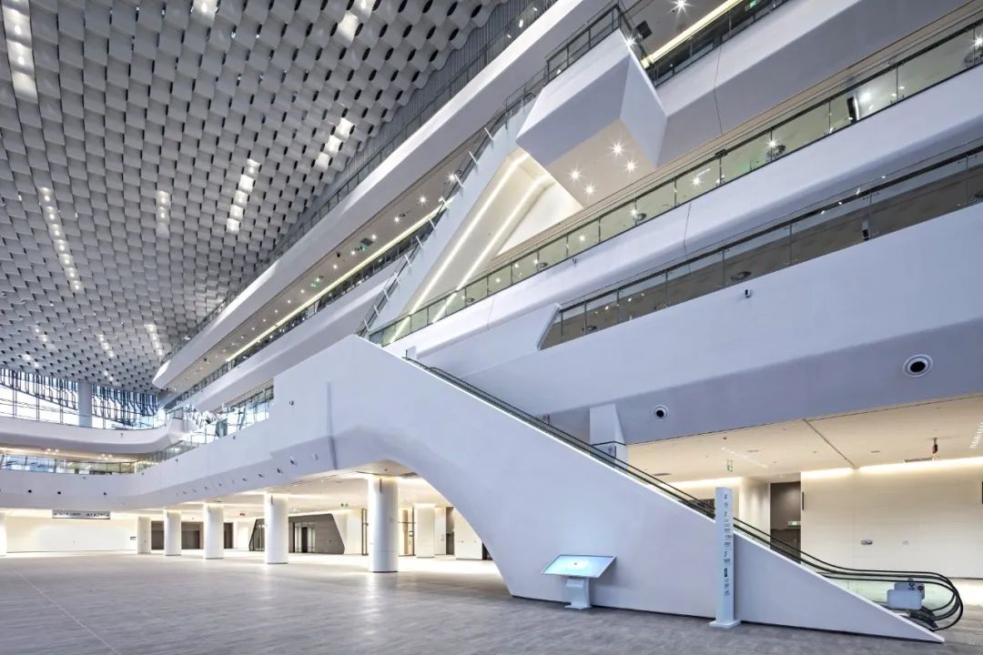 走進門廳,一股簡潔明快、清新大方的現代之風撲面而來。站在高大寬闊的大廳前,人顯得如此渺小。放眼望去,無論是那充滿海浪流動感的四層樓裙,還是那連綿起伏、波瀾涌動的波浪形吊頂,亦或是那鑲嵌在波浪之中宛如明珠般的點點燈光,都讓人有一種身臨浩瀚大海之感。主登錄廳也是整個會展中心最具特色、最核心、最重要的區域之一。
