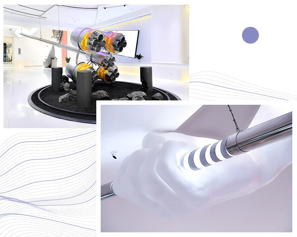 進入展廳,一道紅光閃爍-鳳翅和鳴映入你的眼簾 ,造型靈感來源于鳳凰羽毛跟鳳凰之眼,向右順勢看去,一只強有力的拳頭(凱撒大帝之手)從天花伸出,延生過去就是神六之光,3個概念裝置,全部用鋁材制作,造型復雜,既要保證效果也要考慮安裝跟連接的牢固性,技術及安裝難度很大。項目部在施工現(xiàn)場一次又一次地嘗試,不斷調整,確保不出絲毫偏差。