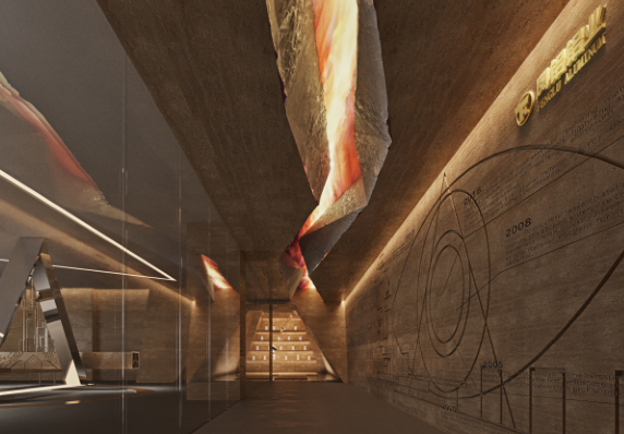 企業(yè)成長是必定經歷種種坎坷的,猶如一段“歷天火而開天地”的涅槃艱辛過程。道路上方由火光躍動的LED屏幕與裂開的天花作為序章。天花側面是鋁材原材剖面藝術展現(xiàn),空間右側蝕刻著企業(yè)的大事記,展示著企業(yè)孜孜奮斗的華美篇章。