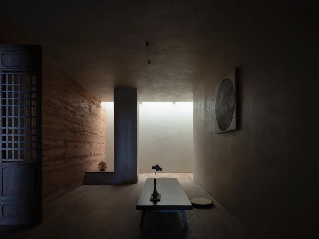 禪修室以獨立的體塊和材質(zhì)插入整體空間,中間的夯土墻歷久而彌堅,打破原有的平整性,意在獲得其與區(qū)域、整體乃至人文歷史的對話關(guān)系。