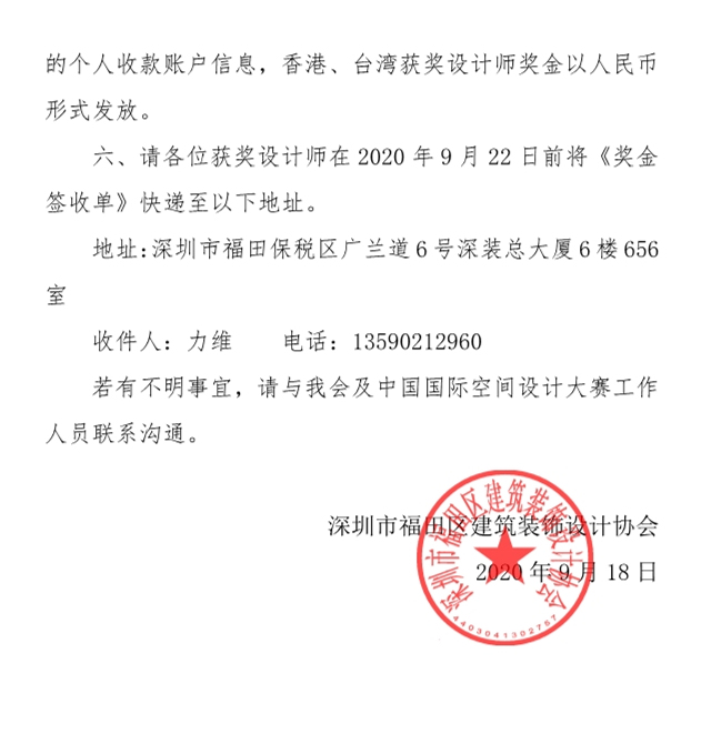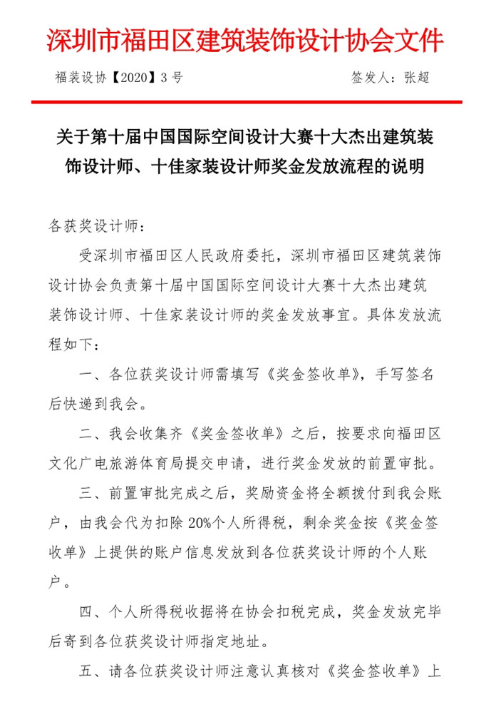 關(guān)于第十屆中國國際空間設(shè)計(jì)大賽十大杰出建筑裝飾設(shè)計(jì)師、十佳家裝設(shè)計(jì)師獎(jiǎng)金發(fā)放流程的說明